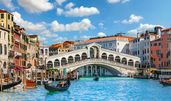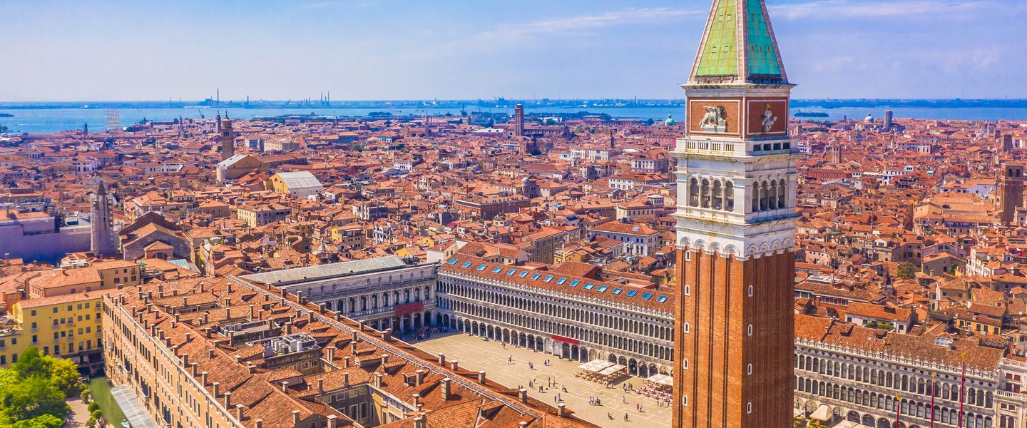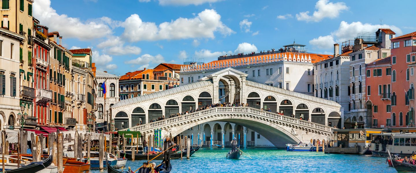 Die einstige „Königin der Meere“ ist aufgrund ihrer einmaligen Lage eine der berühmtesten Touristenstädte der Welt. Die Lagunenstadt besteht aus 118 durch Kanäle voneinander getrennten Inseln, die über rund 400 Brücken miteinander verbunden sind. Unter den 15.000 Gebäuden der Stadt befinden sich 900 Paläste und 105 Kirchen. Alle Bauwerke ruhen auf Pfahlrosten, die bis zu 9 m tief durch den Schwemmsand in die Mergelschicht des Lagunengrundes getrieben wurden. Ein Labyrinth von engen Straßen und Gassen durchzieht die Stadt, die Hauptverkehrswege sind jedoch die Kanäle - unter ihnen der 4 km lange und 40 - 70 m breite Canal Grande mit den prachtvollen Palästen an beiden Ufern und der berühmten Rialtobrücke.